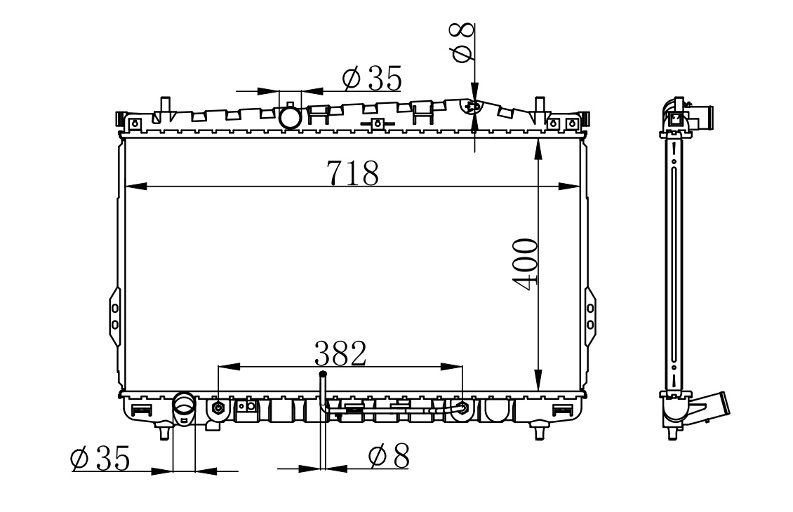 Core Size: 400*718*26 Inlet Tank: 47*727 Outlet Tank: 47*727 Inlet Pipe: 35 Outlet Pipe: 35 Oil Cooler: 382 Composition: Plastic Alloy