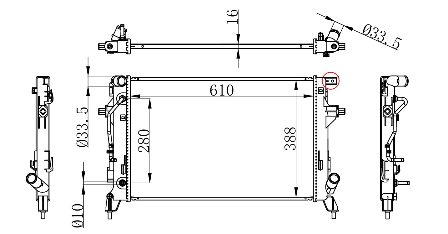 Core Size: 610*388*16 Inlet Tank: 46*415 Outlet Tank: 46*415 Inlet Pipe: 33.5 Outlet Pipe: 33.5 Oil Cooler: 280 Composition: Plastic Alloy