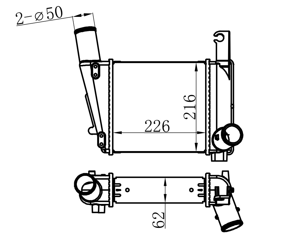 Core Size: 226*216*62 Inlet Tank: 78*228 Outlet Tank: 78*228 Inlet Pipe: 50 Outlet Pipe: 50 Composition: All Alloy