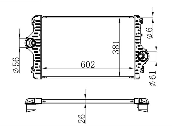 Core Size: 602*381*26 Inlet Tank: 34*412 Outlet Tank: 34*412 Inlet Pipe: 56 Outlet Pipe: 61 Composition: All Alloy