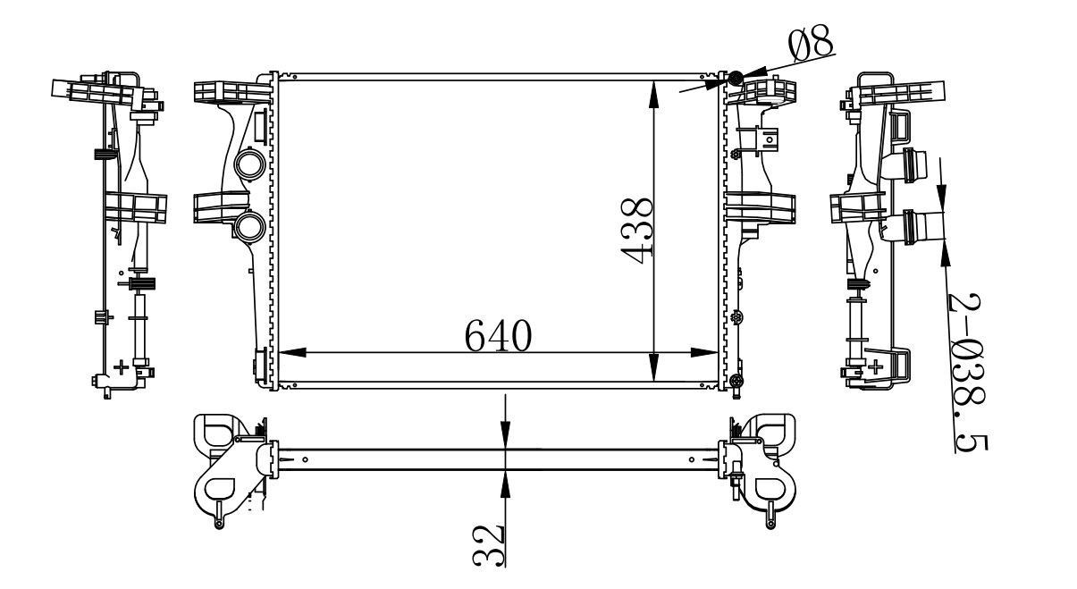 Core Size: 640*438*32 Inlet Tank: 52*461 Outlet Tank: 52*461 Inlet Pipe: 38.5 (Quick Fit) Outlet Pipe: 38.5 (Quick Fit) Oil Cooler: External Composition: Plastic Alloy