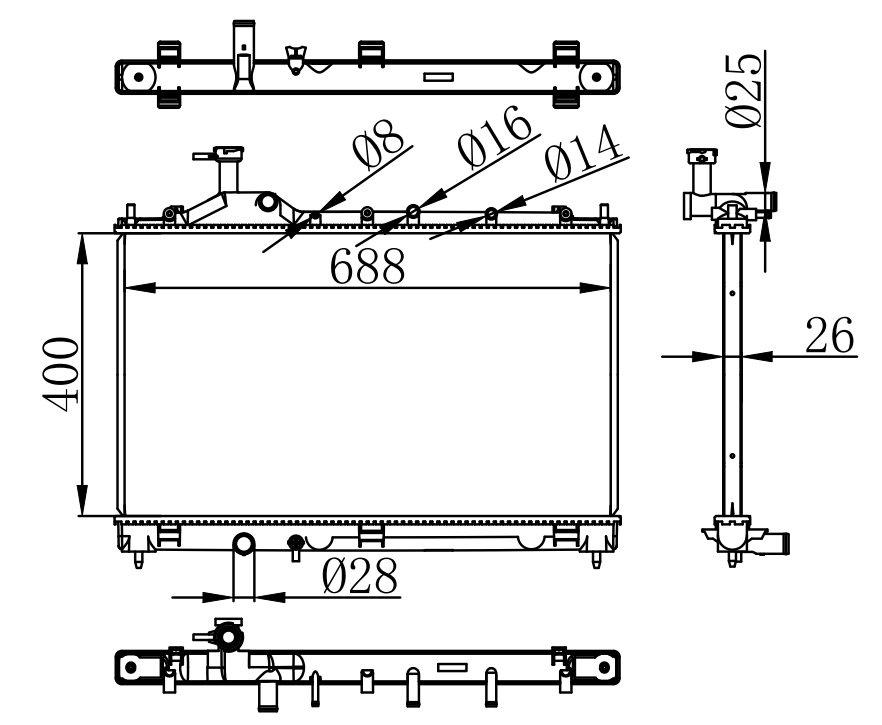 Core Size: 400*688*26 Inlet Tank: 47*713 Outlet Tank: 47*713 Inlet Pipe: 25 Outlet Pipe: 28 Oil Cooler: External Composition: Plastic Alloy