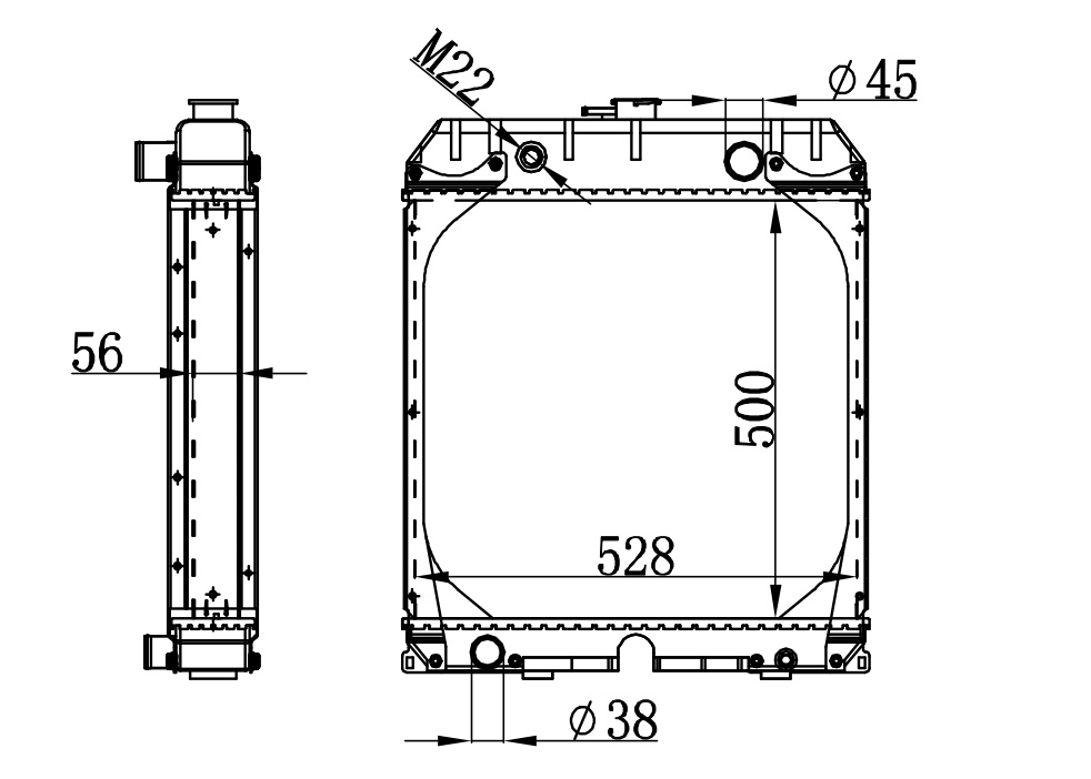 Core Size: 500*528*56 Inlet Tank: 96*555 Outlet Tank: 96*555 Inlet Pipe: 45 Outlet Pipe: 38 Oil Cooler: M/T Composition: Plastic Alloy