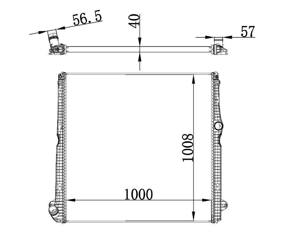Core Size: 1000*1008*40 Inlet Tank: 60*1031 Outlet Tank: 60*1031 Inlet Pipe: 57 Outlet Pipe: 56.5 (Snap On) Oil Cooler: Composition: Plastic Alloy