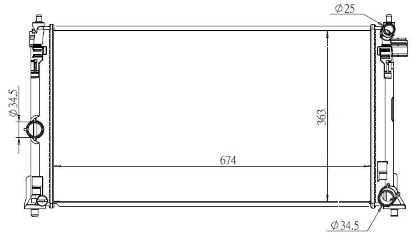Core Size: 674*363*16 Inlet Tank: 43*388 Outlet Tank: 43*388 Inlet Pipe: 34.5 Outlet Pipe: 34.5 Oil Cooler: External Composition: Plastic Alloy
